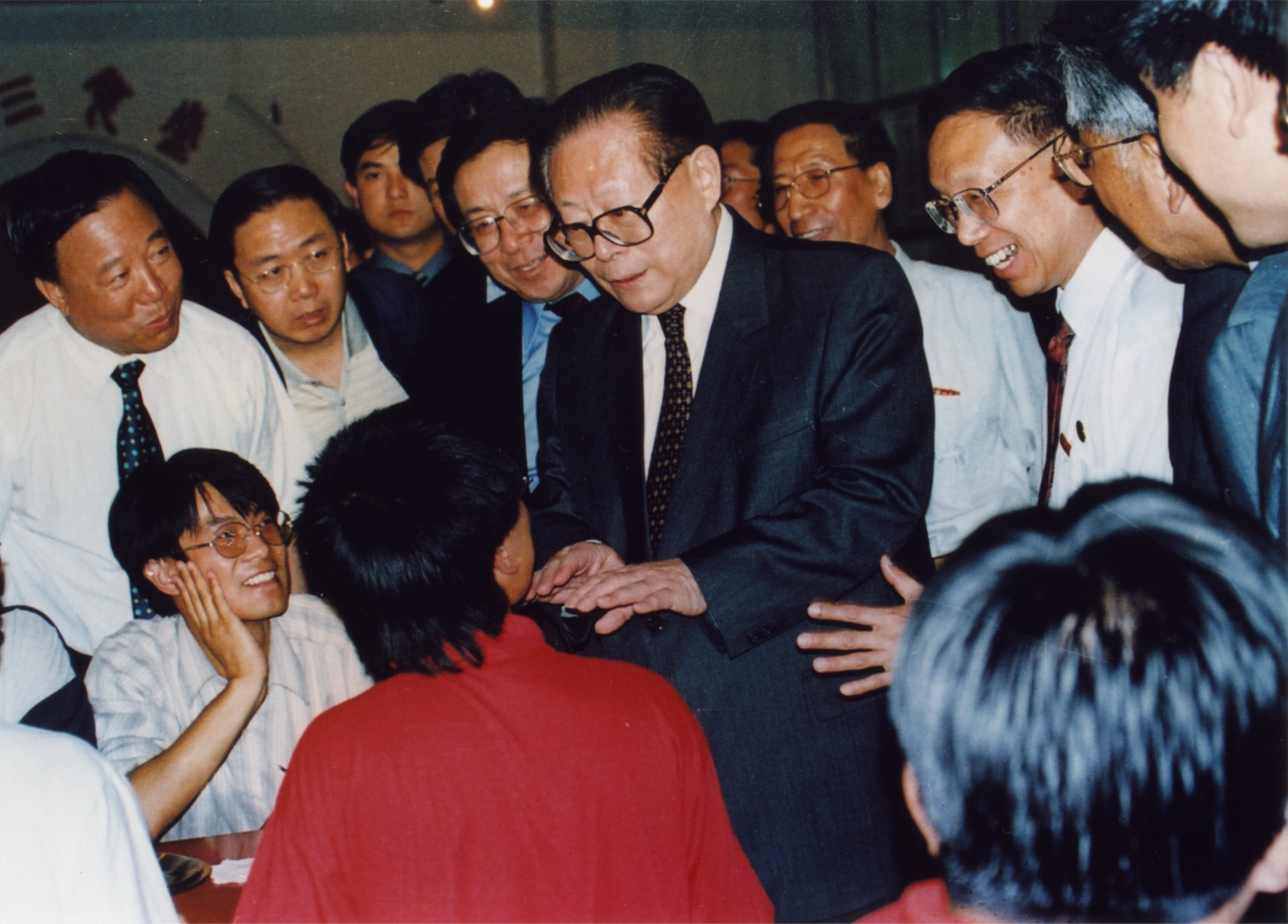 2000年6月19日,江泽民总书记来我校视察,与我校学生亲切...